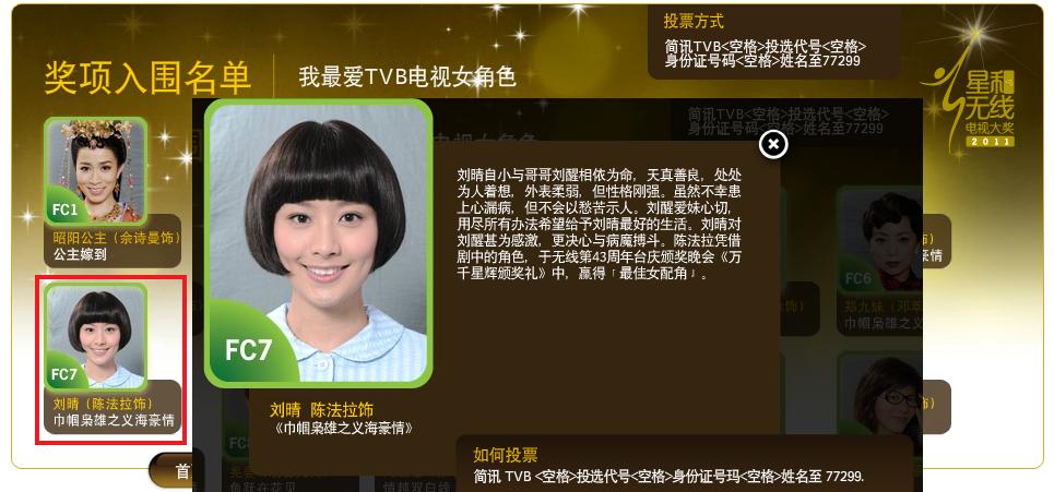 Vote for Lau Ching as 'My Favourite Female Character'. SMS TVB[space]FC7[space]NRIC[space]Name to 77299.